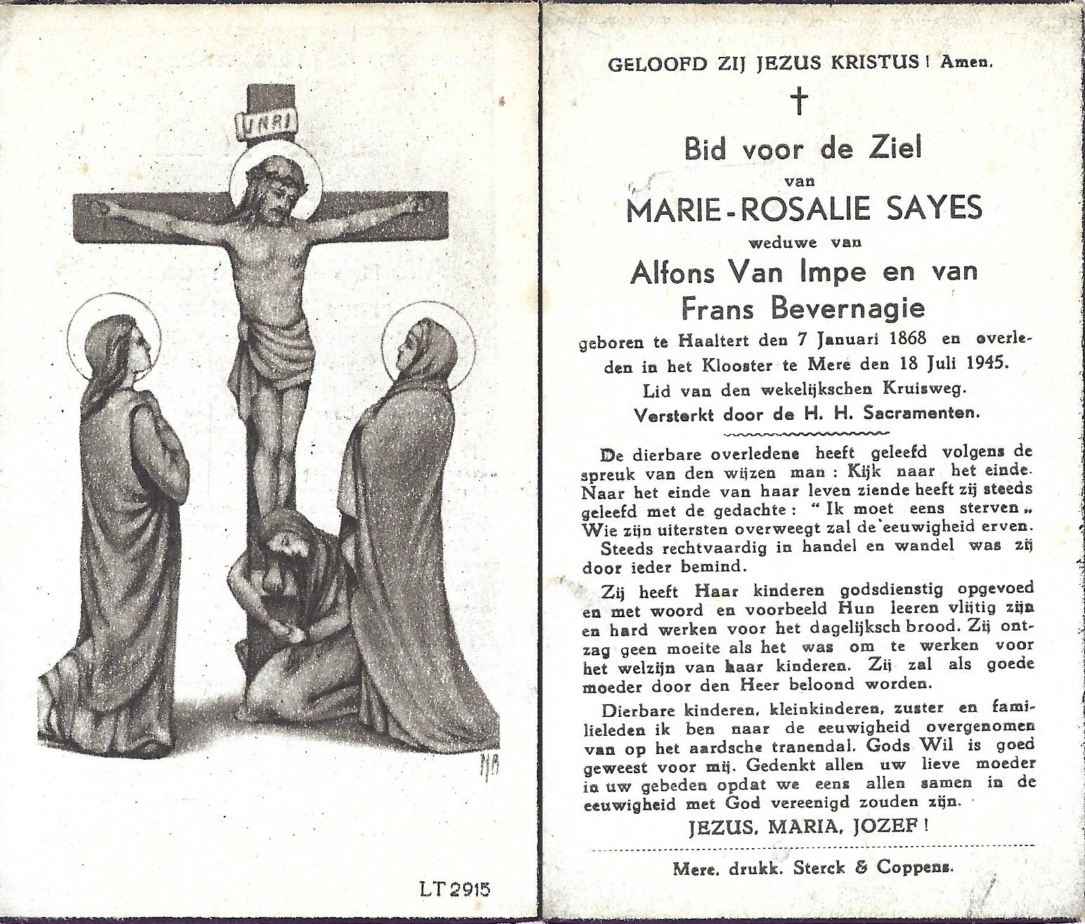 | Sayes Marie Rosalie | Van Impe Alfons en Bevernagie Frans | Haaltert | 07/01/1868 | Mere | 18/07/1945 |