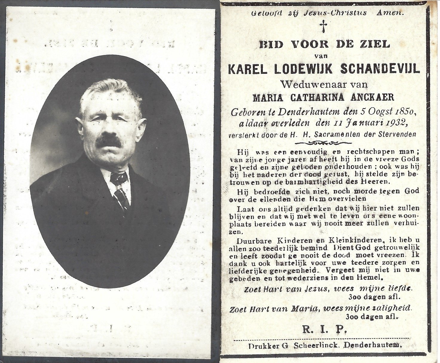 | Schandevijl Karel Lodewijk | Anckaer Maria Catharina | Denderhoutem | 05/08/1850 | Denderhoutem | 11/01/1932 |
