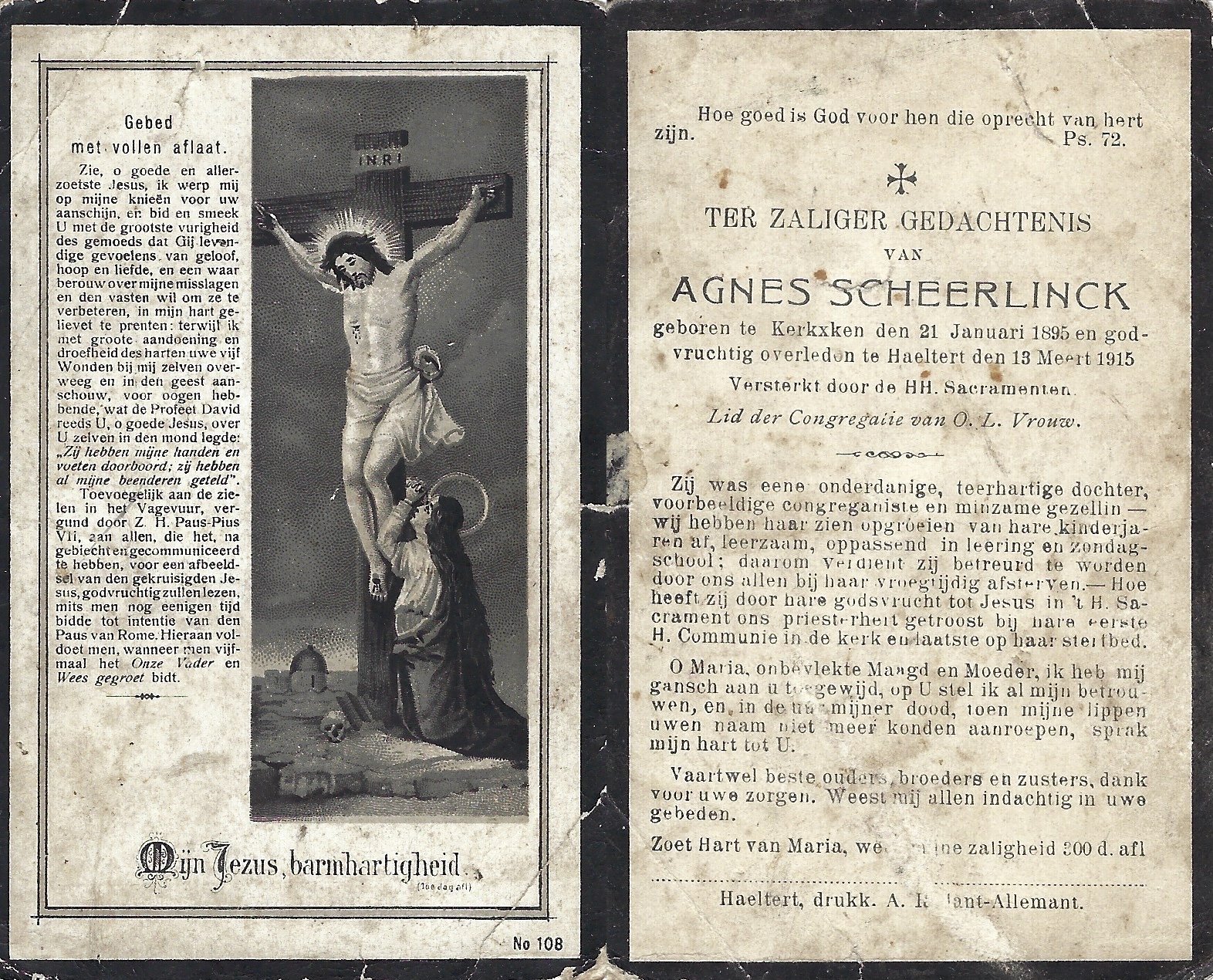 | Scheerlinck Agnes | Kerksken | 21/01/1895 | Haaltert | 13/03/1915 | |