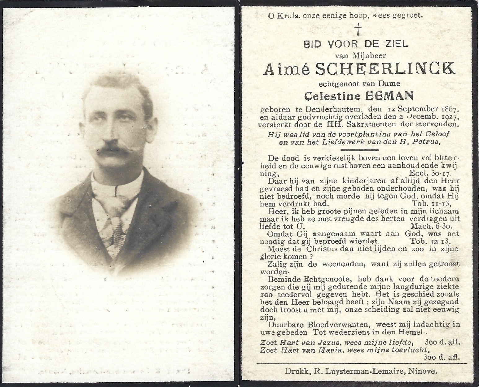 | Scheerlinck Aimé | Eeman Celestine | Denderhoutem | 12/09/1867 | Denderhoutem | 02/12/1927 |