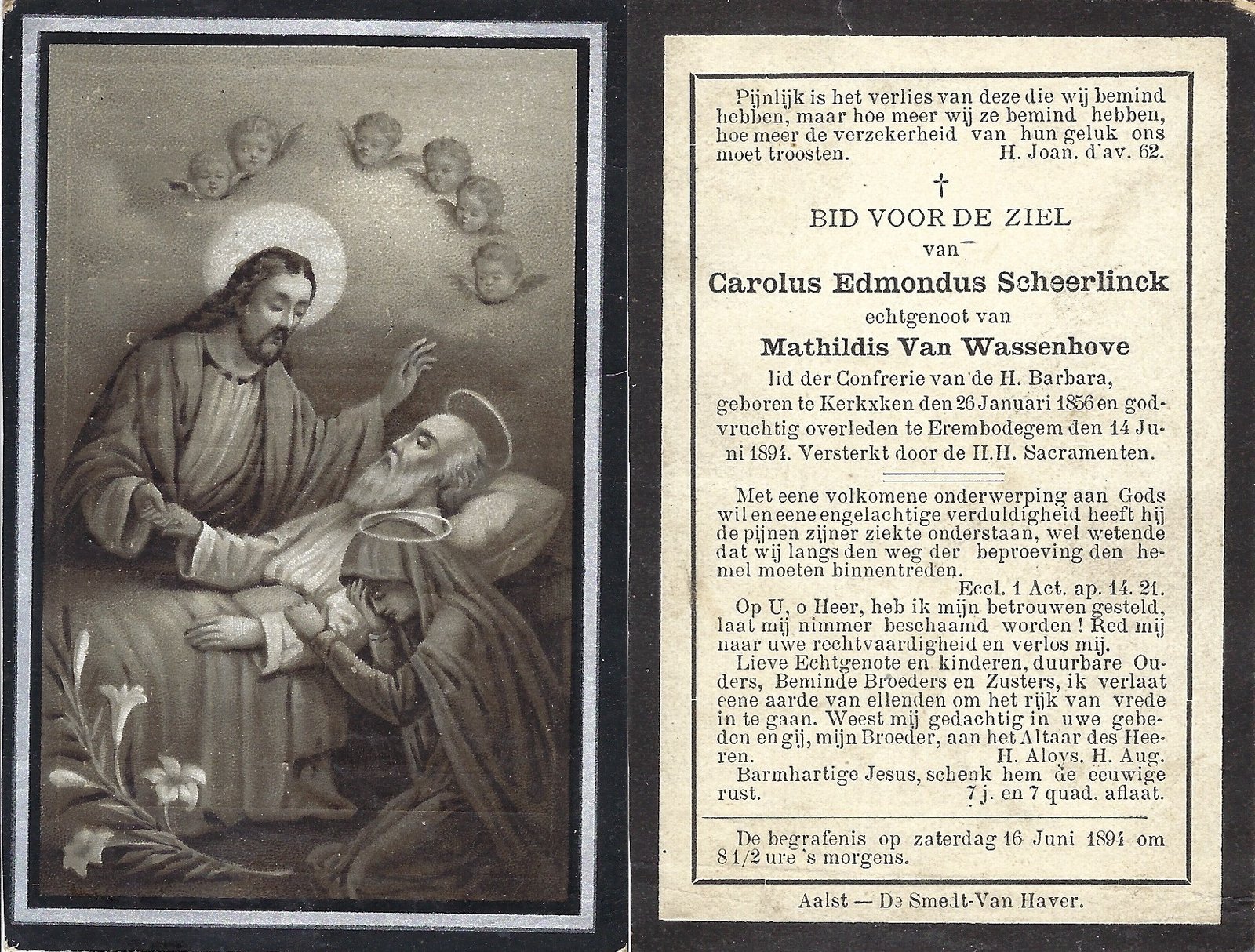 | Scheerlinck Carolus Edmondus | Van Wasserhove Mathildis | Kerksken | 26/01/1856 | Erembodegem | 14/06/1894 |