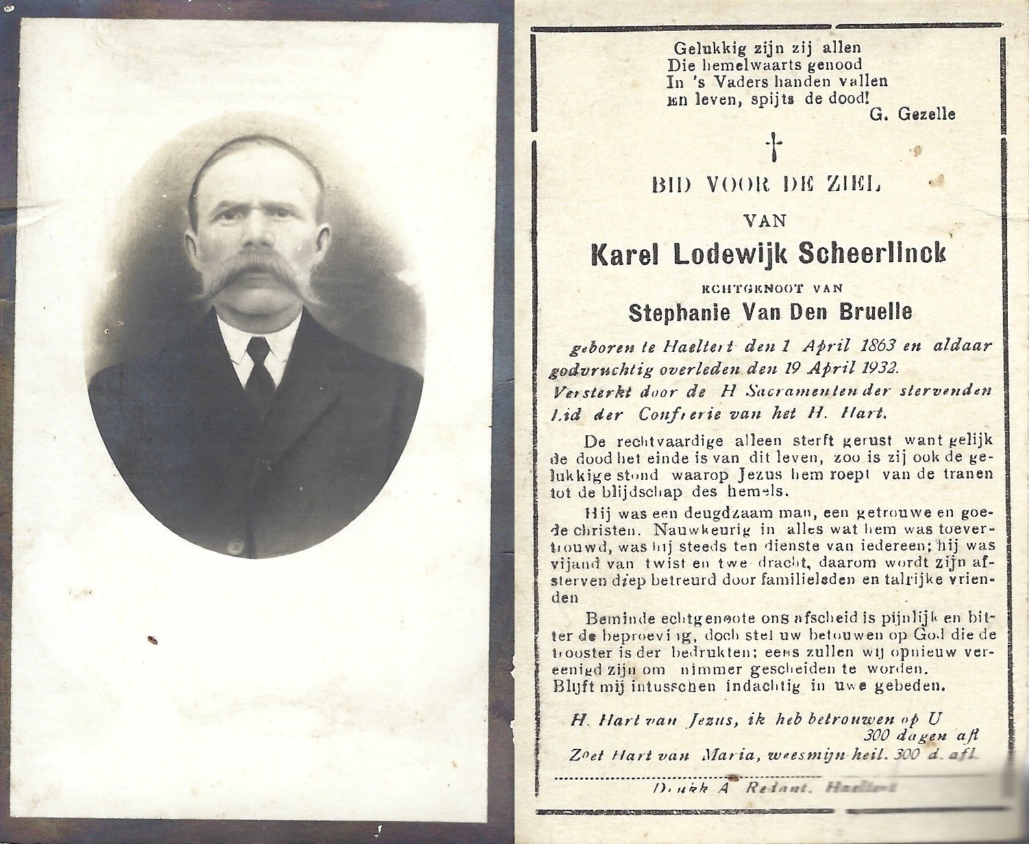 | Scheerlinck Karel Lodewijk | Van Den Bruelle Stephanie | Haaltert | 01/04/1863 | Haaltert | 19/04/1932 |