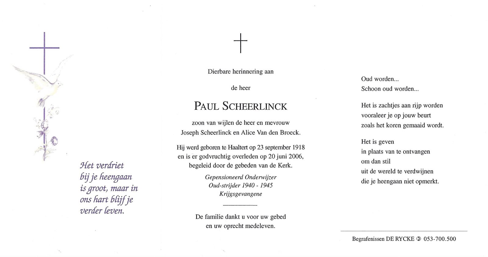 | Scheerlinck Paul | Haaltert | 23/09/1918 | Haaltert | 20/06/2006 | |