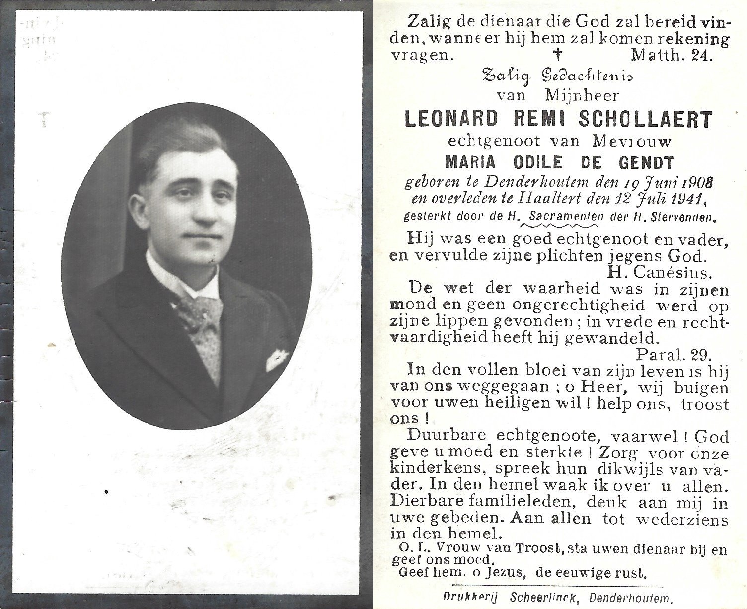 | Schollaert Leonard Remi | De Gendt Maria Odile | Denderhoutem | 19/06/1908 | Haaltert | 12/07/1941 |