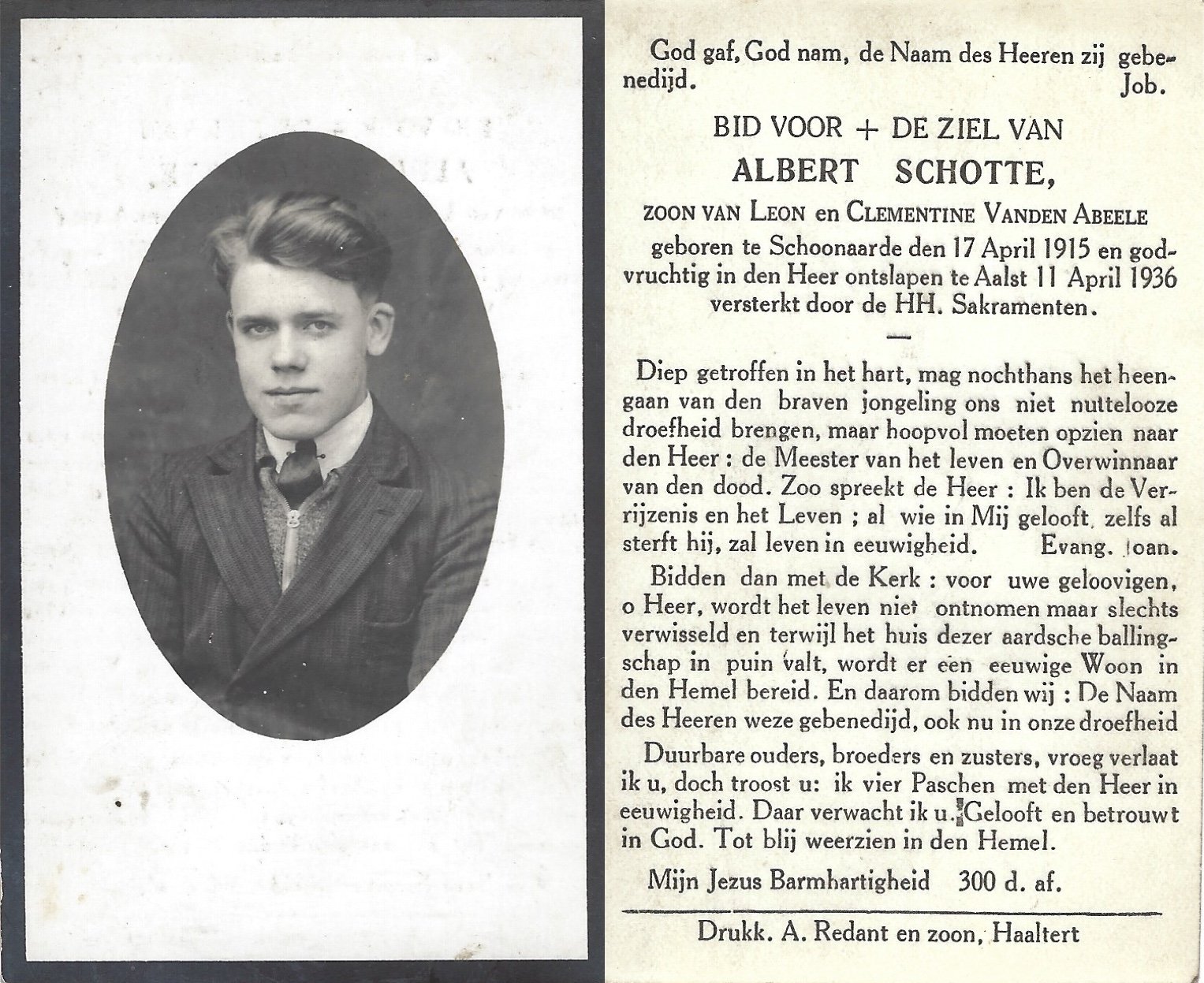 | Schotte Albert | Schoonaarde | 17/04/1915 | Aalst | 11/04/1936 | |