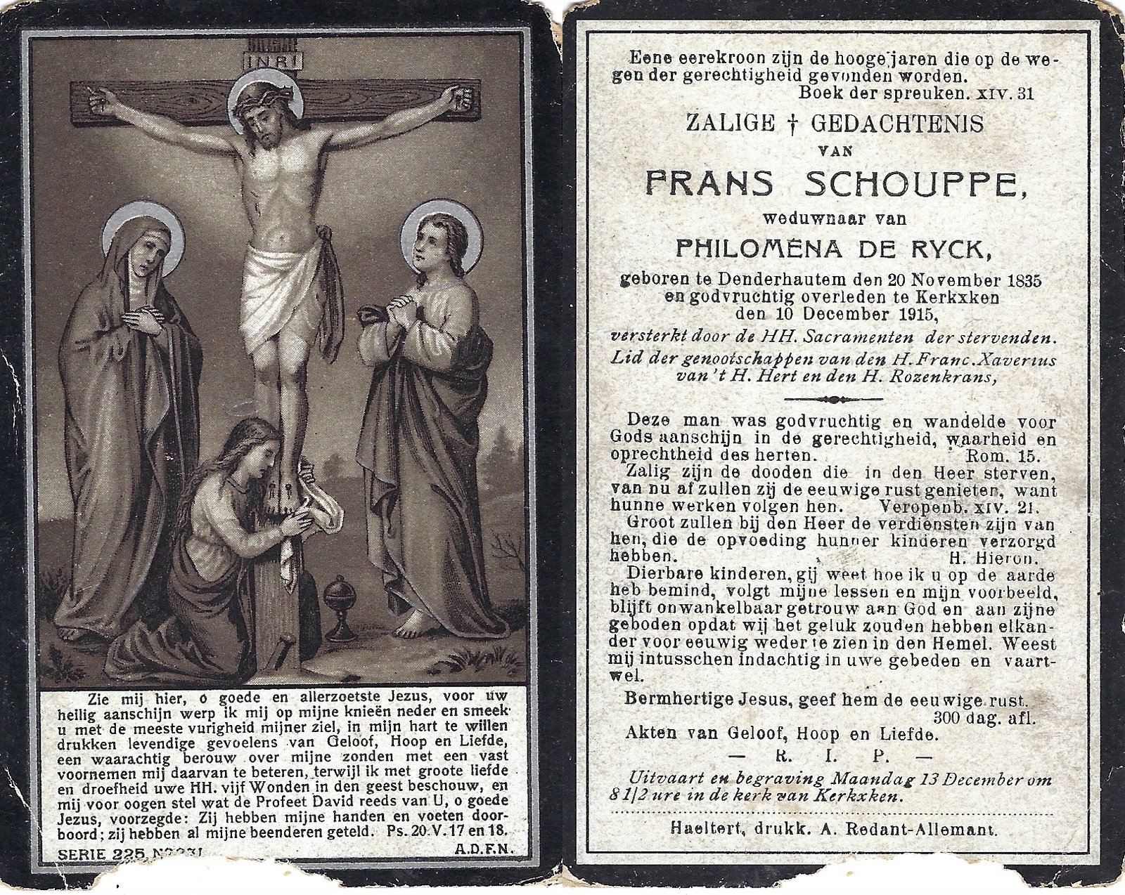 | Schouppe Frans | De Ryck Philomena | Denderhoutem | 20/11/1835 | Kerksken | 10/12/1915 |