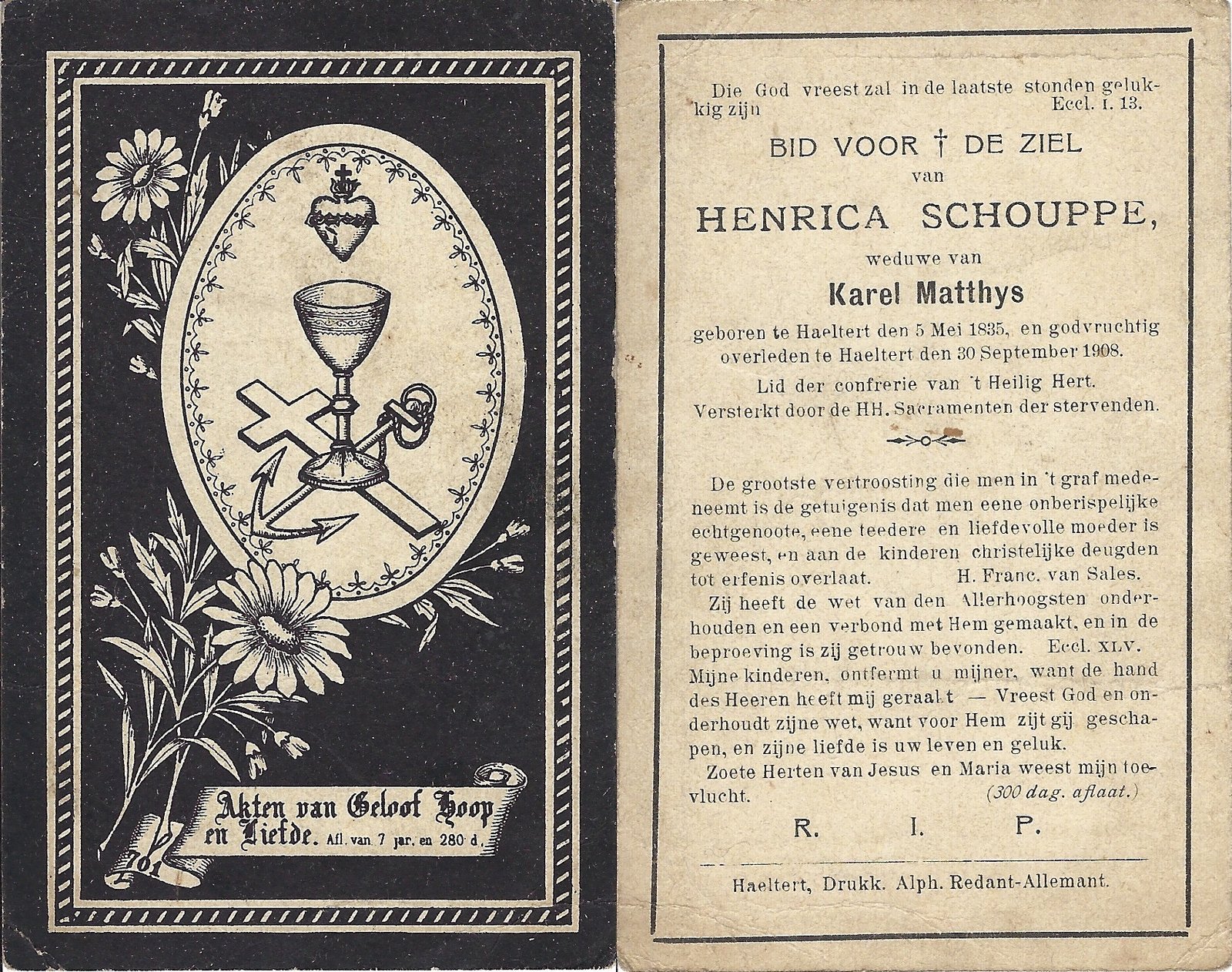 | Schouppe Henrica | Matthys Karel | Haaltert | 05/05/1835 | Haaltert | 30/09/1908 |