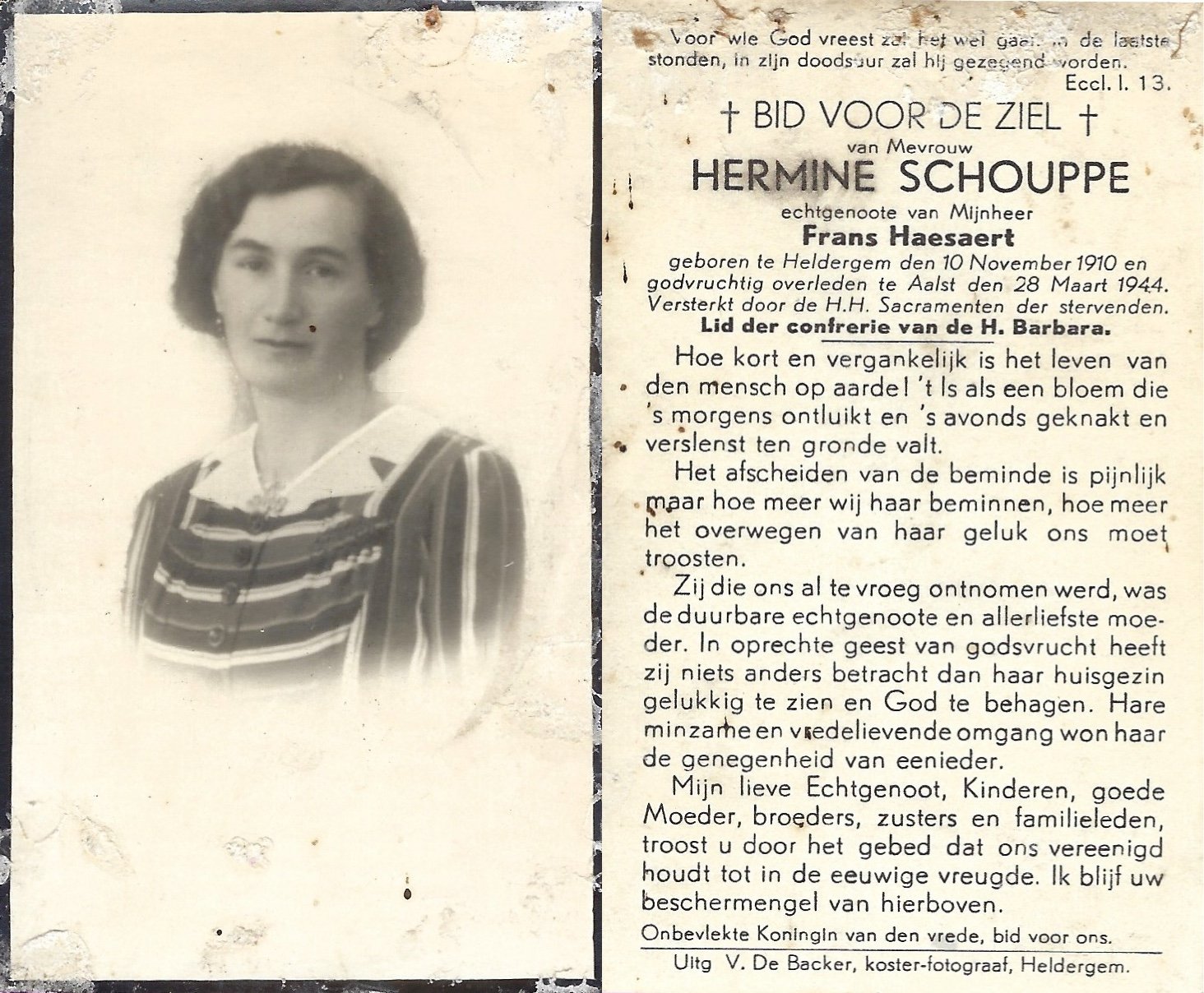 | Schouppe Hermine | Haesaert Frans | Heldergem | 10/11/1910 | Aalst | 28/03/1944 |
