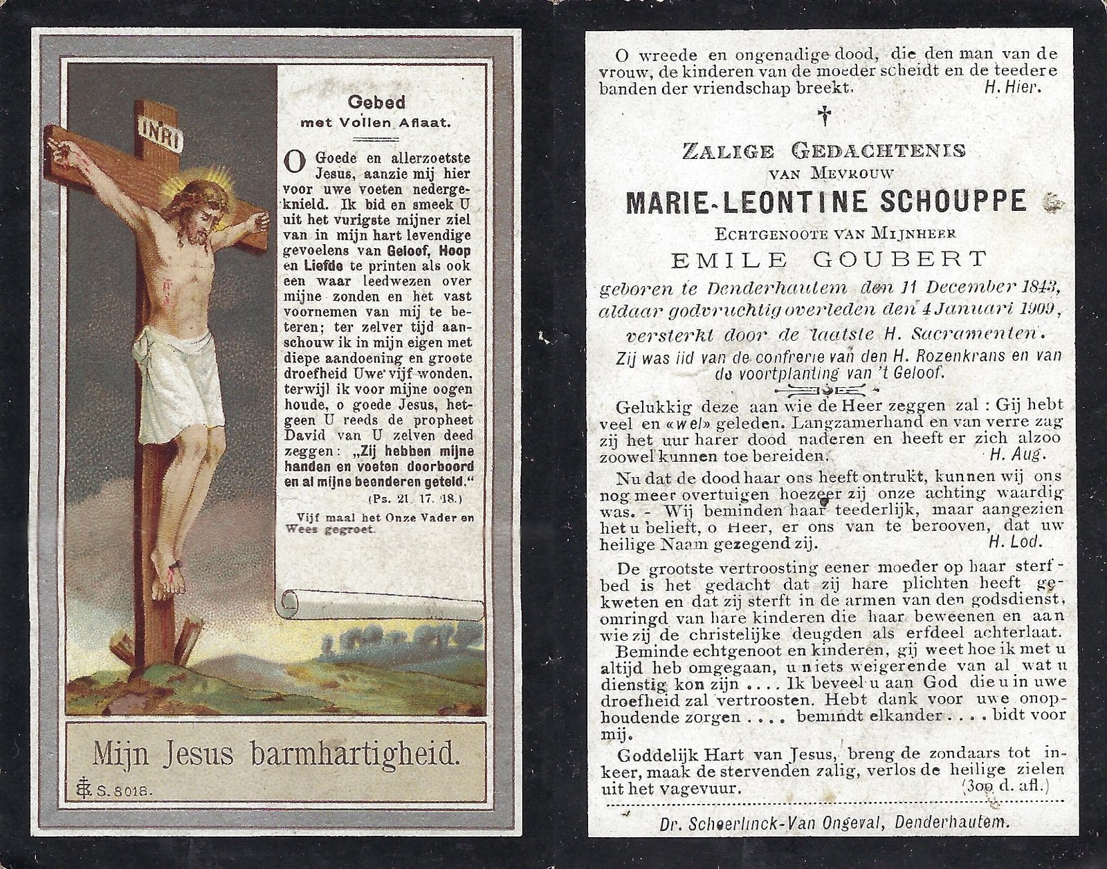 | Schouppe Leontine | Goubert Emile | Denderhoutem | 11/12/1843 | Denderhoutem | 04/01/1909 |