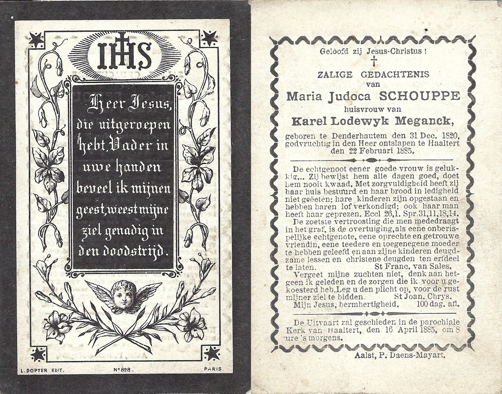 | Schouppe Maria Judoca | Meganck Karel Lodewyk | Denderhoutem | 31/12/1820 | Haaltert | 22/02/1885 |