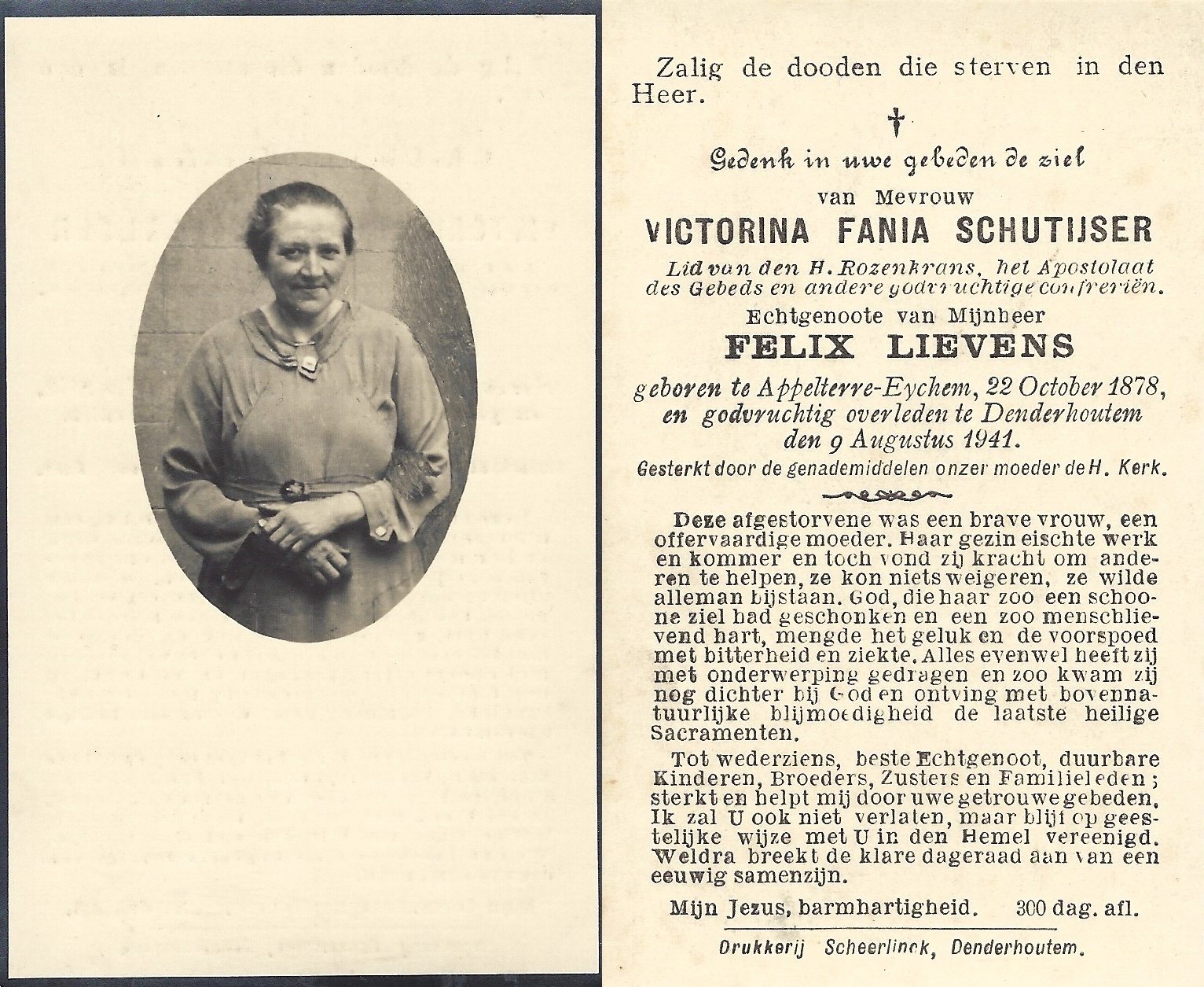 | Schutijser Victorina Fania | Lievens Felix | Appelterre | 22/10/1878 | Denderhoutem | 09/08/1941 |