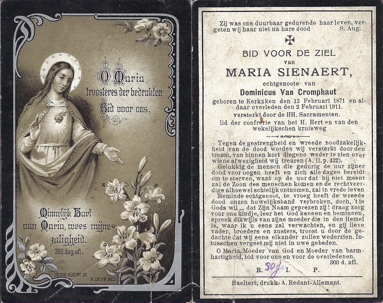 | Sienaert Maria | Van Cromphaut Dominicus | Kerksken | 13/02/1871 | Kerksken | 02/02/1911 |