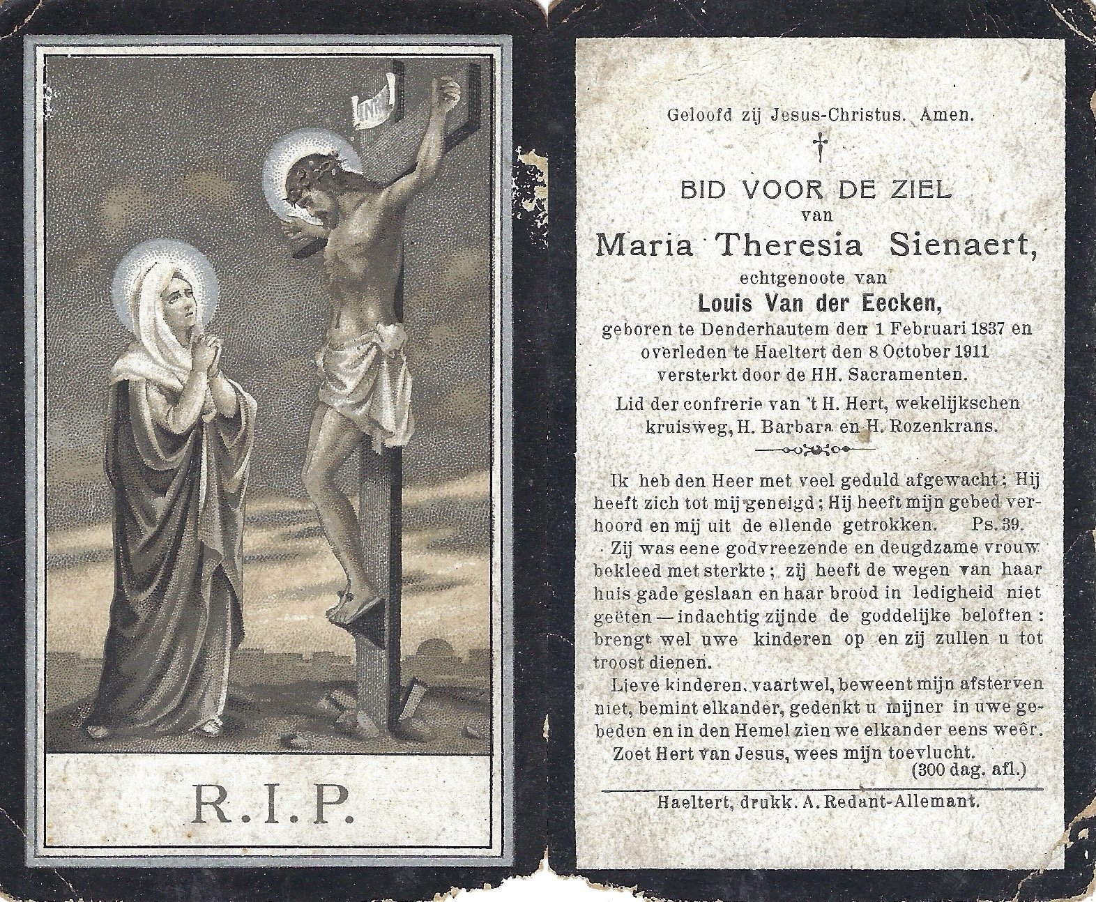 | Sienaert Maria Theresia | Van der Eecken Louis | Denderhoutem | 01/02/1837 | Haaltert | 08/10/1911 |