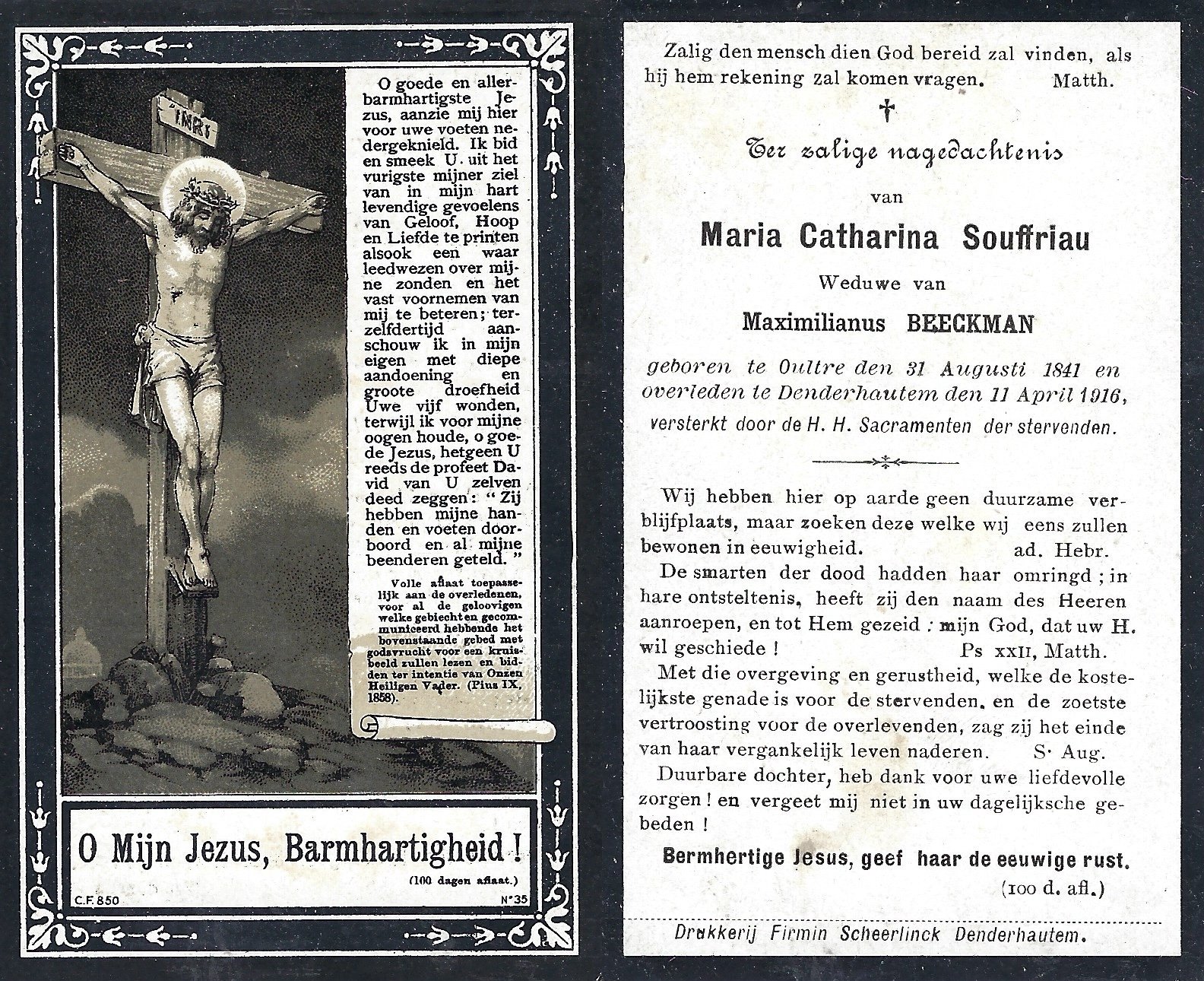 | Souffriau Maria Catharina | Beeckman Maximilianus | Outer | 31/08/1841 | Denderhoutem | 11/04/1916 |
