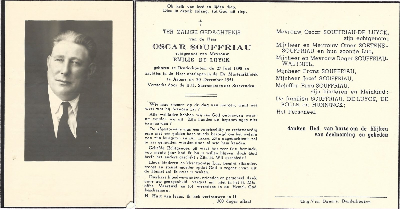 | Souffriau Oscar | De Luyck Emilie | Denderhoutem | 27/06/1898 | Astene | 30/12/1951 |