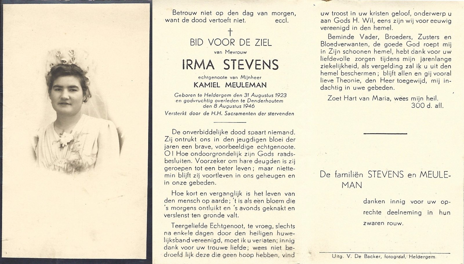 | Stevens Irma | Meuleman Kamiel | Heldergem | 31/08/1923 | Denderhoutem | 08/08/1946 |